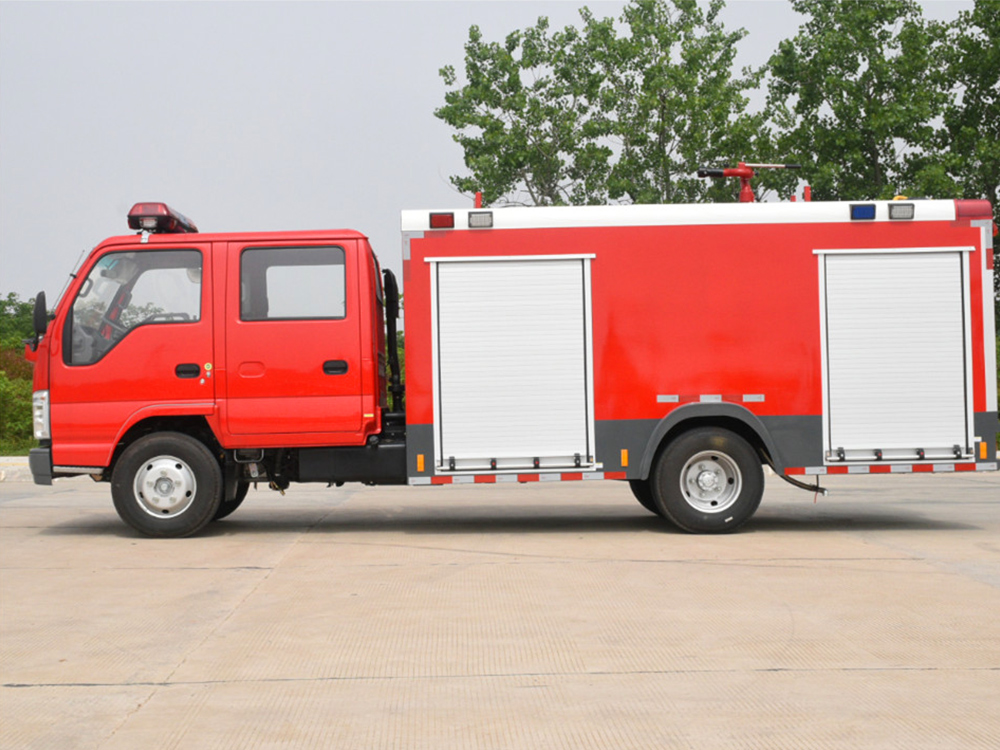 消防泵在箱体中间或者后置,泵房左右两侧4个出水口、器材箱左右后侧均有新款易拉高强度铝合金卷帘门。